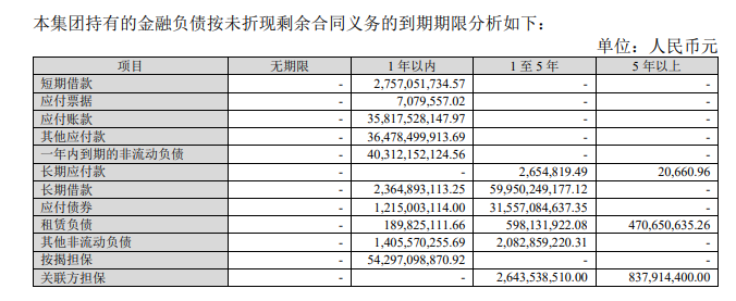 值得关注的是,金地集团2022年中报披露了金融负债的到期期限。除403亿元的一年内到期非流动负债外,公司还存在358亿元的应付账款。财报显示,其应付账款主要为一年内账期的应付建筑工程款及土地价款。
