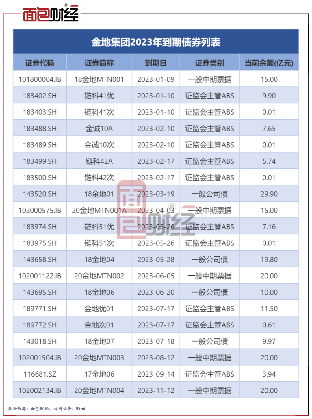 信披数据显示,目前公开市场存续债券中,发行人或穿透信用主体为金地集团的债券(包括证监会主管ABS、一般公司债、一般中期票据、海外债、超短期融资债券)共计44笔,合计余额约为467.36亿元。其中,金地集团2023年年内到期债券余额约为206亿元。