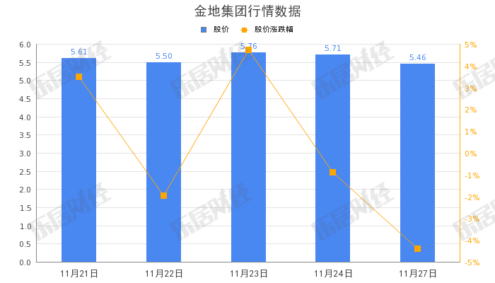 截至11月27日,金地集团(600383.SH)股价收盘报5.71元,跌4.38%,总市值246.50亿元。