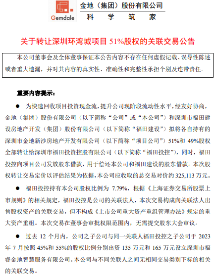 公告提到,为快速回收项目投资现金流,提升金地集团现阶段流动性水平,金地集团和深圳市福田建设房地产开发(集团)股份有限公司(以下简称“福田建设”)拟将各自持有的深圳市金地新沙房地产开发有限公司(以下简称“项目公司”)51%和49%股权全部转让给深圳市福田投资控股有限公司(以下简称“福田投控”),同时,福田投控向项目公司发放股东借款,用于偿还本公司和福田建设的股东借款。本次股权转让交易定价以评估结果为依据,本公司应收取的总交易对价约325,113万元。