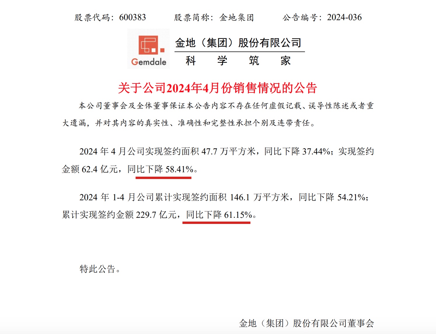 根据公告,2024年4月份,金地集团实现签约面积47.7万平方米,同比下降37.44%;实现签约金额62.4亿元,同比下降58.41%。