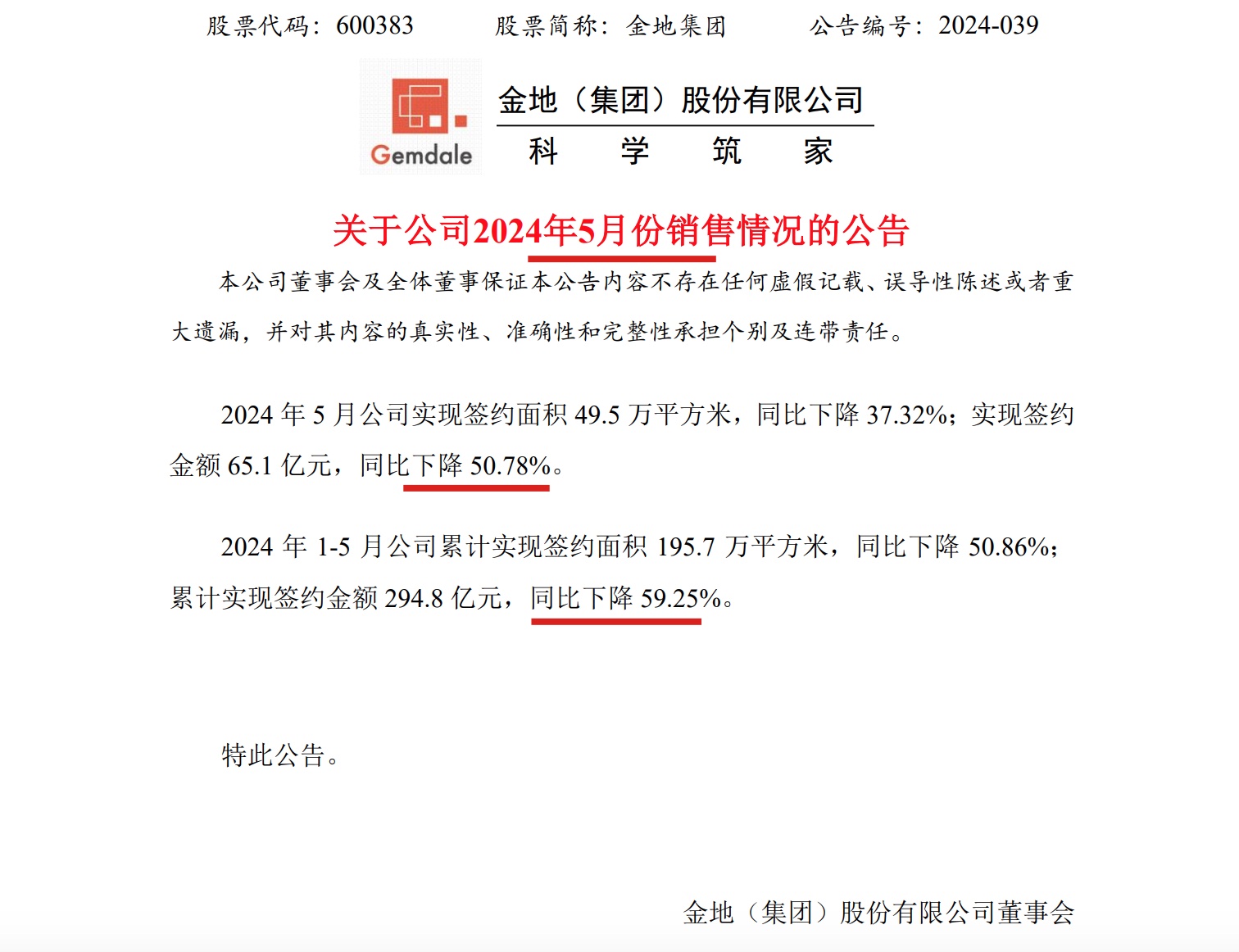金地(集团)股份有限公司(金地集团,600383.SH)公开披露公司2024年5月份销售情况。