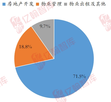 从收入构成上看,房地产业务结转收入为141亿元,同比下降54.7%,占总收入比重71.5%,物业管理收入为37.1亿元,同比增长2.6%,占总收入比重18.8%,物业出租及其他收入为19.1亿元,同比下降2.43%,占总收入比重9.7%。