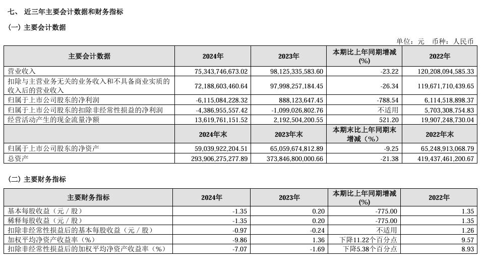 近日,金地集团发布了2024年年度报告。报告显示,期内金地集团实现营业收入753.44亿元,同比下降23.22%;归属于母公司所有者的净利润为-61.15亿元,同比下降788.54%,基本每股收益亏损1.35元。这是金地集团自2001年上市以来,归母净利润首次转为亏损。