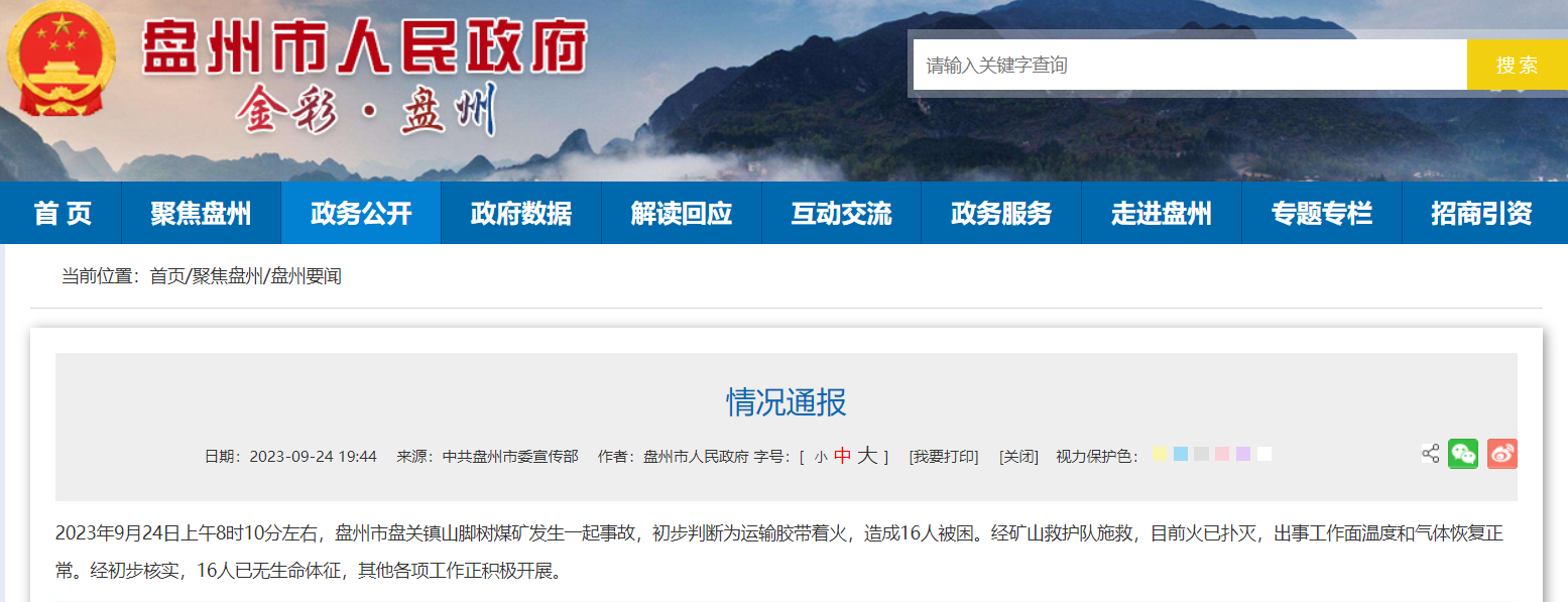 据贵州省盘州市人民政府网站消息,2023年9月24日上午8时10分左右,盘州市盘关镇山脚树煤矿发生一起事故,初步判断为运输胶带着火,造成16人被困。经矿山救护队施救,目前火已扑灭,出事工作面温度和气体恢复正常。经初步核实,16人已无生命体征。其他各项工作正积极开展。