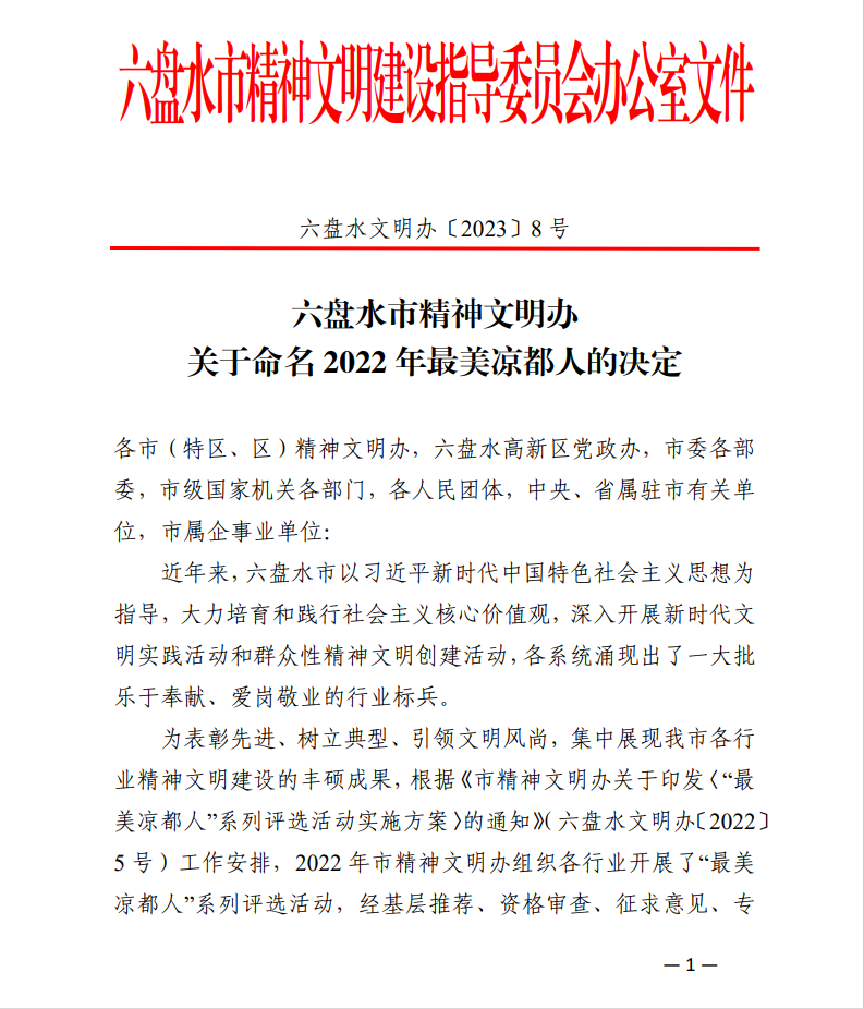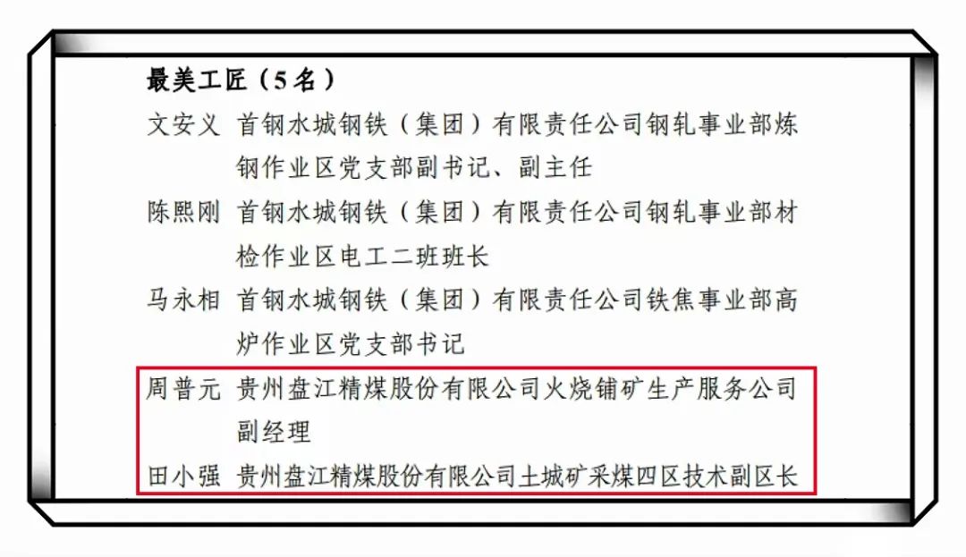 日前,六盘水市精神文明建设指导委员会办公室行文,表彰2022年最美凉都人。火铺矿生产服务公司副经理周普元、土城矿采煤四区技术副区长田小强荣获“最美工匠”称号。