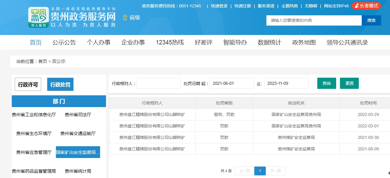国家矿山安全监察局贵州局公开信息显示,山脚树矿近年来曾多次受到处罚。