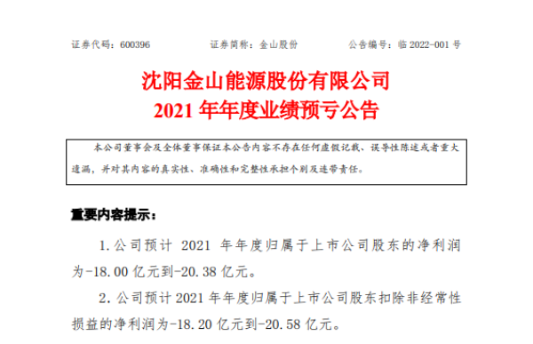 1月5日晚间,沈阳金山能源股份有限公司(金山股份,600396)发布公告:公司预计2021年归属上市公司股东净利润将亏损18亿元-20.38亿元,同比减少金额18.82亿元-21.20亿元。