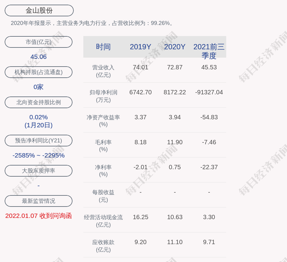 2020年年报显示,金山股份的主营业务为电力行业,占营收比例为:99.26%。