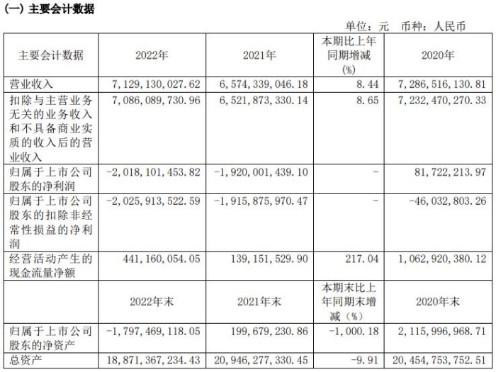 年报显示,*ST金山在2022年度实现营业收入71.29亿元,同比增长了8.44%,但是归母净利润为-20.18亿元,出现了连续巨额亏损,同比亏损扩大5.11%,2021年和2022年合计已经亏掉39.38亿元。截至2022年年末,*ST金山的归母净资产为-17.97亿元,出现资不抵债的情况。