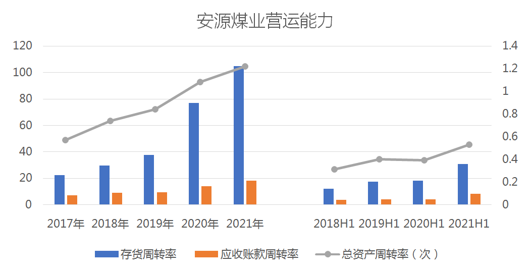 从半年报来看,2018年至2021年上半年,安源煤业的存货周转率分别为12.15、17.45、18.35、30.73,2021年上半年公司较2020年同期相比有所上升。应收账款周转率分别为3.76、4.35、4.36、8.34,2021年上半年公司应收账款周转率较2020年同期相比有所上升。总资产周转率分别为0.31次、0.40次、0.39次、0.53次,2021年上半年公司总资产周转率较2020年同期相比有所上升。