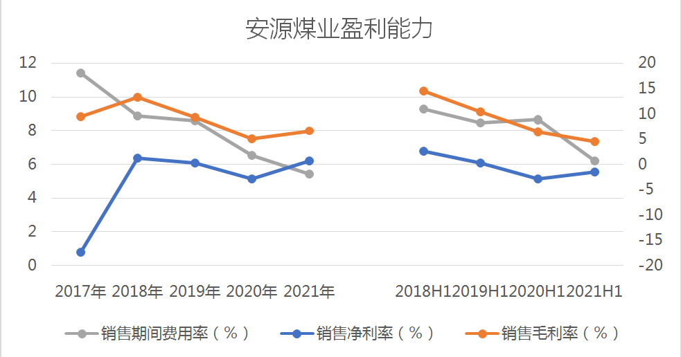从半年报来看,2018年至2021年上半年,安源煤业的销售净利率分别为2.56%、0.29%、-2.94%、-1.56%,2021年上半年公司销售净利率较2020年同期相比有所上升但仍为负值。销售毛利率分别为14.56%、10.44%、6.46%、4.48%,2021年上半年公司销售毛利率较2020年同期相比有所下降。销售期间费用率分别为9.29、8.48、8.65、6.21,2021年上半年公司销售期间费用率较2020年同期相比有所下降。