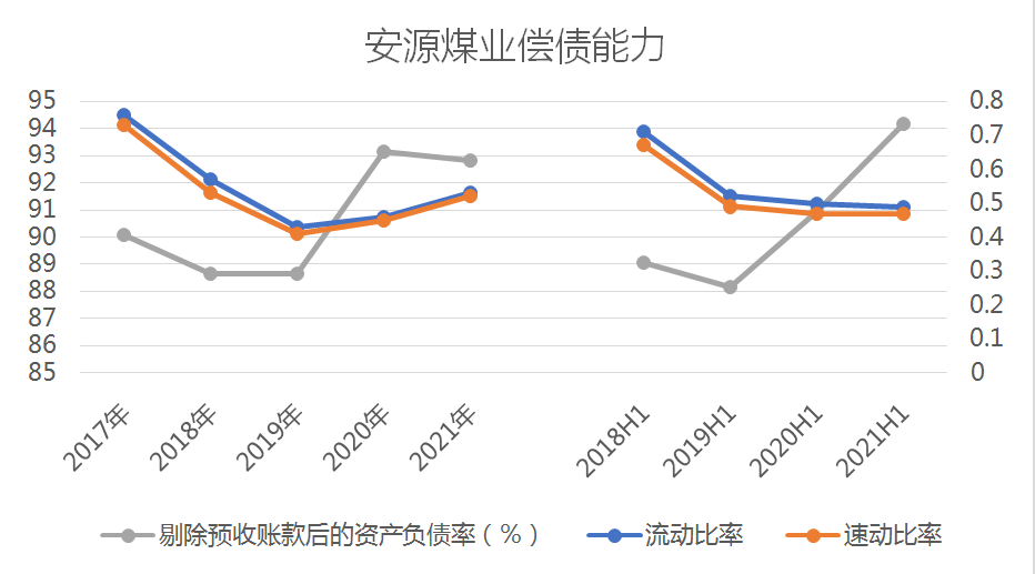 从半年报来看,2018年至2021年上半年,安源煤业的流动比率分别为0.71、0.52、0.50、0.49,2021年上半年公司流动比率较2020年同期相比有所下降。速动比率分别为0.67、0.49、0.47、0.47,2021年上半年公司速动比率较2020年同期持平。剔除预收账款后的资产负债率分别为89.08%、88.17%、90.96%、94.17%,2021年上半年公司剔除预收账款后的资产负债率较2020年同期相比有所上升。