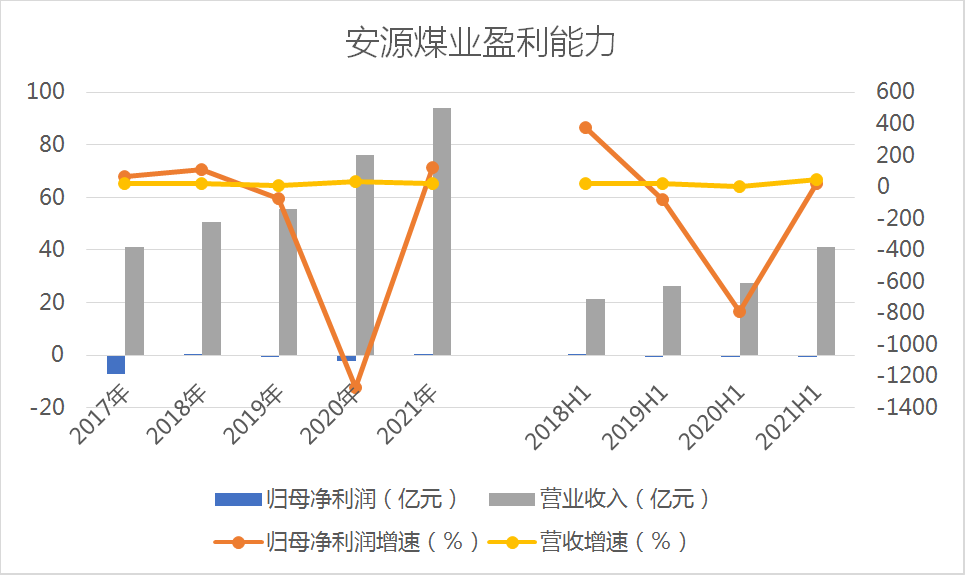 从半年报来看,2018年至2021年上半年,安源煤业的归母净利润分别为0.56亿元、0.12亿元、-0.80亿元、-0.60亿元,2021年上半年公司归母净利润较2020年同期相比有所上升仍为负值。归母净利润增速分别为379.34%、-79.20%、-788.73%、24.88%,2021年上半年公司归母净利润增速较2020年同期相比大幅度上升,归母净利润增速由负转正。营业收入分别为21.42亿元、26.17亿元、27.35亿元、41.01亿元,2021年上半年公司营业收入较2020年同期相比有所上升。营收增速分别为22.20%、22.18%、4.50%、49.92%,2021年上半年公司营收增速较2020年同期相比有大幅度上升。