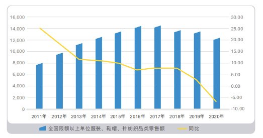 根据国家统计局数据显示,我国限额以上单位服装鞋帽、针纺织品零售总额在2016年达到高峰,以后逐年下滑。2020年全国限额以上单位服装鞋帽、针纺织品零售总额1.24万亿元,同比减少6.6%;限额以上单位服装类商品零售额8824亿元,同比下降8.1%。