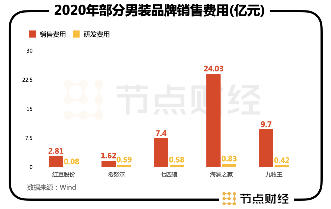 如下图所见,2020年,“男人的衣柜”们在营销上的投入均大幅超过其在研发上的投入。