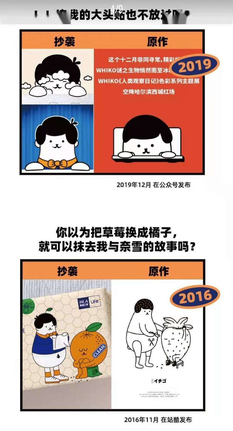 12月15日,谜之生物股份有限公司旗下知名零食品牌WHIKO谜之生物在其官方微博发布消息称,自家品牌插画被海澜之家生活家抄袭。帖文显示,海澜之家生活家产品的包装插画上,卡通形象“小海”的设计创意与WHIKO谜之生物的IP形象雷同。同时,其内容页、包装页的设计与构图,也大范围抄袭了WHIKO谜之生物在2016年至2021年的作品。