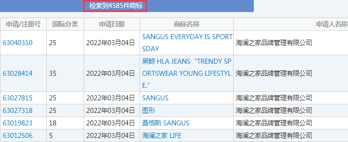 据查询,截至目前,海澜之家品牌管理有限公司共申请注册了4585件商标,涵盖“海澜之家”“男人的衣柜 MENSWARDROBE”“海澜优选”等多件品牌商标,目前绝大多数商标已成功注册。