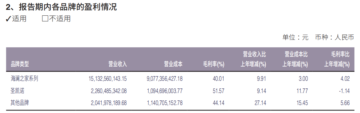 报告期内,海澜之家集团旗下品牌共计门店7652家,其中海澜之家直营门店727家,加盟门店4945家,其他品牌门店共计1980家。值得关注的是,海澜之家直营门店的毛利率已达40.01%,帮助海澜之家线下渠道实现主营业务收入167.09亿元,同比增长8.54%。