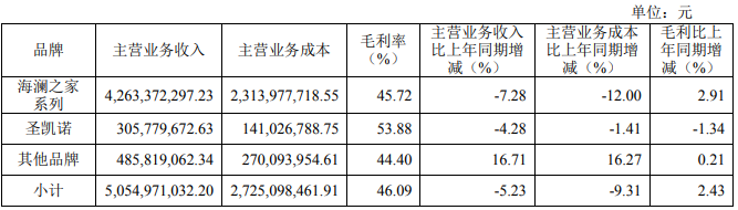 其中海澜之家品牌营收同比下跌7.28%至42.63亿元,圣凯诺营收减少4.28%至3.06亿元,涵盖OVV、黑鲸等品牌的其他品牌营收则继续上涨,同比增长16.71%至4.85亿元。