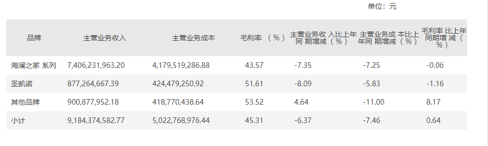 具体来看,今年上半年,海澜之家品牌营收74.06亿元,同比减少7.35%;圣凯诺营收8.77亿元,同比减少8.09%;其他品牌营收9.01亿元,同比增加4.64%。