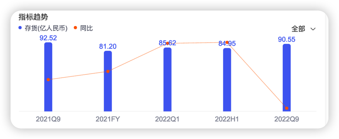 一个难忽视的问题,存货高企。截至2022年9月末,海澜之家库存高达90.55亿元,同比下降,环比上半年上升。