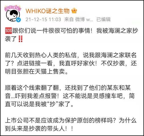2021年12月,原创消费品牌WHIKO谜之生物称,被海澜之家抄袭了品牌IP形象,指出并非灵感撞车,而是被抄到“家”,还放出相似度十足的对比图片。