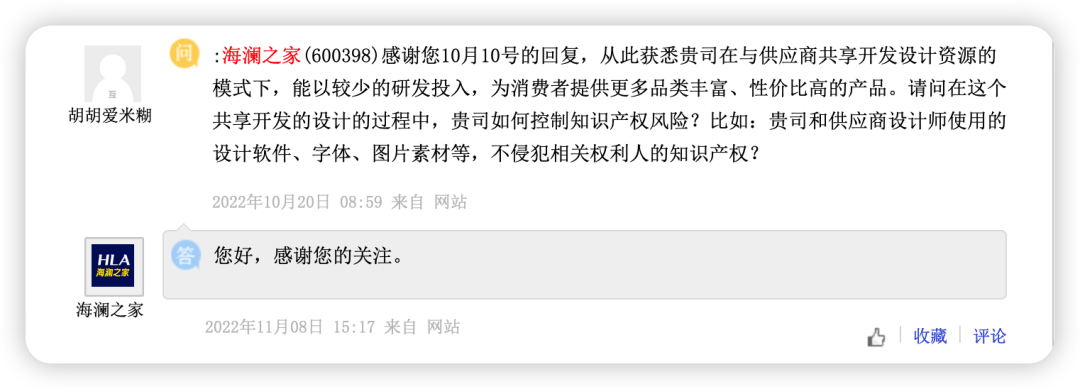 在互动平台上,有投资者提问:贵司在与供应商共享开发设计资源的模式下,能以较少的研发投入,为消费者提供更多品类丰富、性价比高的产品。请问在这个共享开发的设计的过程中,贵司如何控制知识产权风险?比如:贵司和供应商设计师使用的设计软件、字体、图片素材等,不侵犯相关权利人的知识产权?