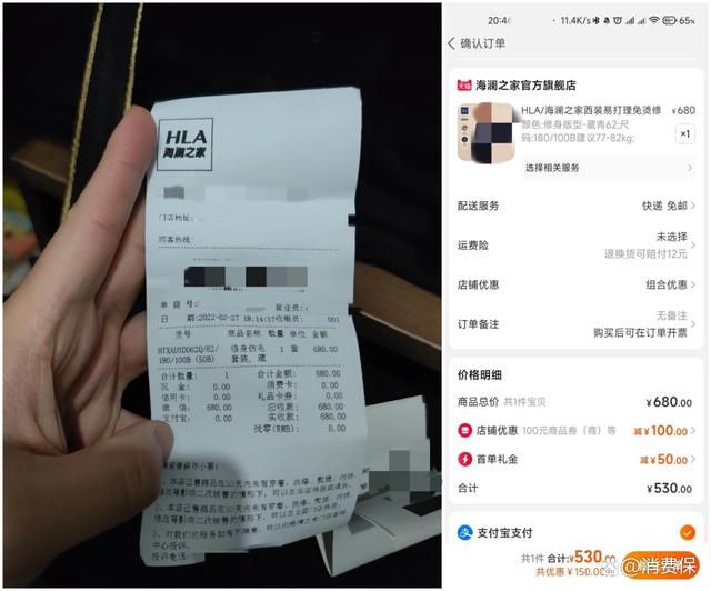 投诉人訾先生称,在海澜之家实体店购买了680元的衣服,却发现天猫海澜之家官方旗舰店优惠后只需530元,比实体店便宜了150元。