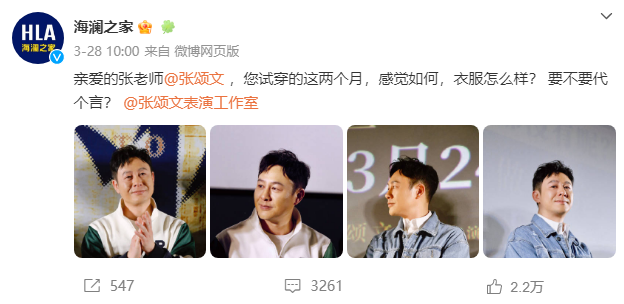 3月28日上午10点,海澜之家官方微博发了这样一条动态,“亲爱的张老师,您试穿的这两个月,感觉如何,衣服怎么样?要不要代言?”并@了张颂文及张颂文表演工作室。