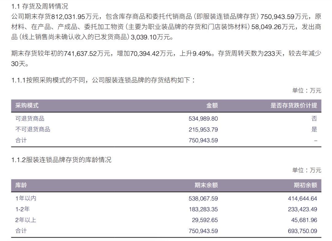 因而,在这样杠杆式的商业模式之下,就算2021年海澜之家的存货周转天数长达到了233天,“在企业身上的压力实则也没有那么大”,杨大筠说。
