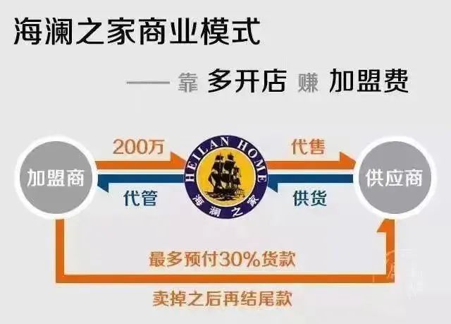 简单理解就是,海澜之家整合上游服装厂,以先拿货后付款的方式(在货品最初入库的时候,海澜之家并不会一次性支付全部货款,而是支付不超过30%,后续资金随货品的实际销售情况逐月结算)获得货品,再投入下游的加盟直营店之中。