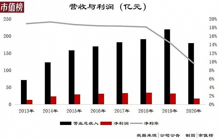 2020年年底,海澜集团迎来了新转折,创始人周建平辞去董事长位置,正式交棒儿子周立宸;2021年4月,海澜之家披露了自上市以来最低的年报盈利,受疫情冲击,公司在2020年实现营业收入179.6亿元,较2019年减少了18.3%,归母净利润才17.8亿元,同比大跌44.4%。