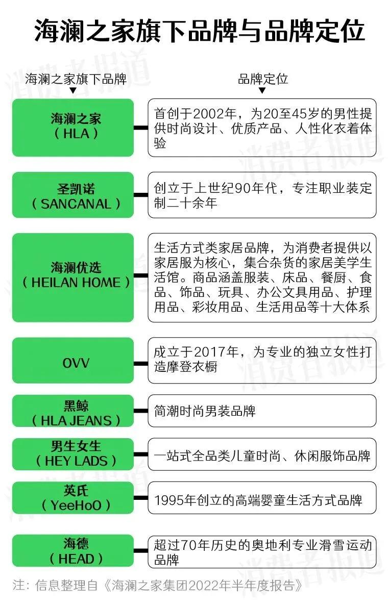提到海澜之家,我们总能想起“男人的衣柜”这句口号。实际上,海澜之家雄心勃勃,要做“全家人的衣柜”。除了海澜之家(HLA)外,海澜之家集团的业务覆盖男装、女装、童装、职业装、家居用品等细分领域。旗下有圣凯诺(SANCANAL)、海澜优选(HEILAN HOME)、OVV、黑鲸(HLA JEANS)、男生女生(HEY LADS)、英氏(YeeHoO)、海德(HEAD)等品牌。