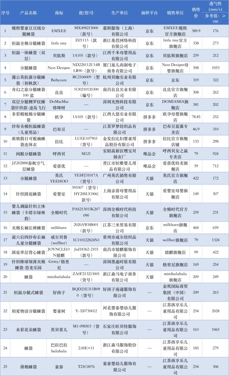 另外,在2022年11月,英氏1款售价为422元的分腿睡袋在江苏省消保委的婴幼儿睡袋比较试验中被实测发现透气性只有172mm/s,低于所参考的行业标准FZ/T 73022-2019《针织保暖内衣》的要求(≥180mm/s),透气性在25款样品中排在最后一位。