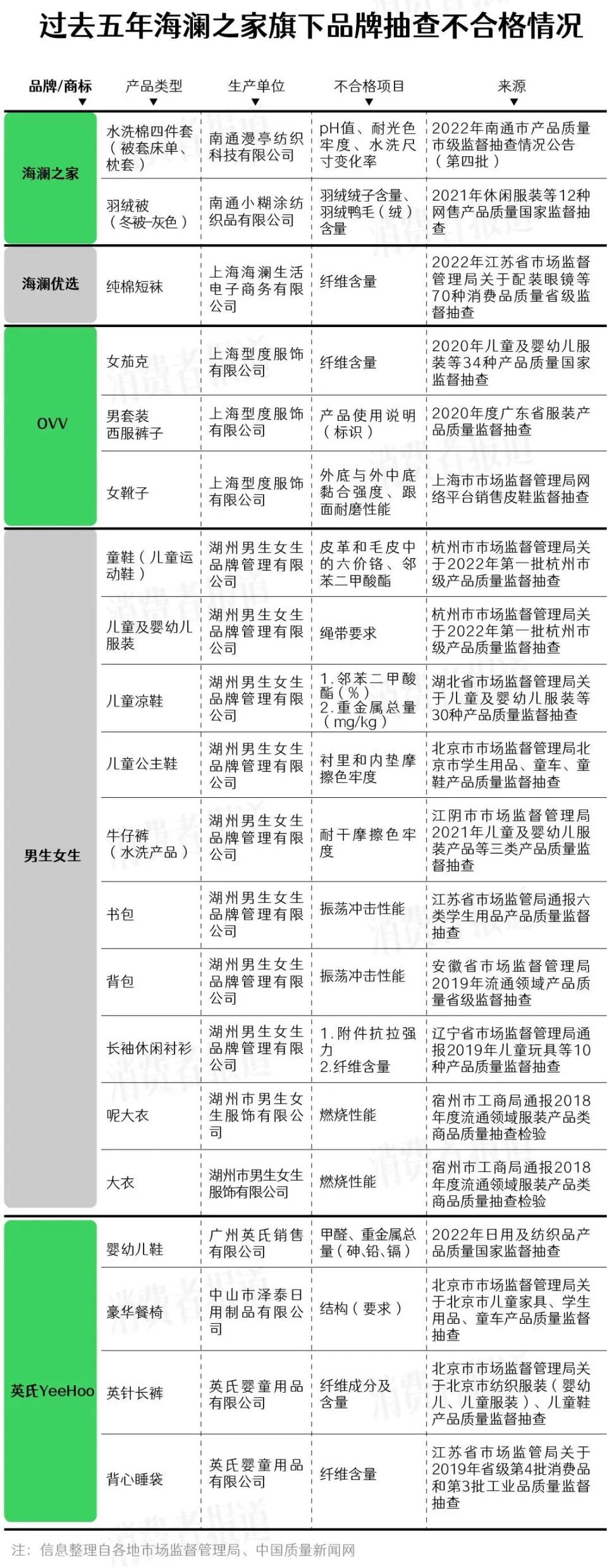 《消费者报道》对海澜之家相关产品的抽查情况进行了统计。过去五年,海澜之家集团旗下各品牌在全国各地区市场监督管理局共出现抽查不合格批次20个,其中海澜之家2个、海澜优选1个、OVV3个、男生女生10个、英氏4个。