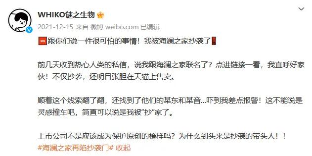 2021年底,海澜之家被一个小众原创IP设计品牌“WHIKO谜之生物”投诉抄袭。