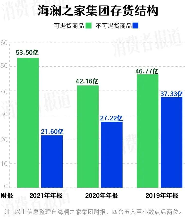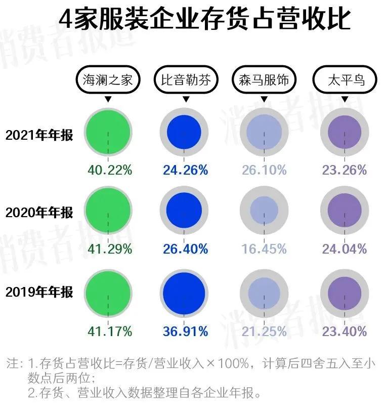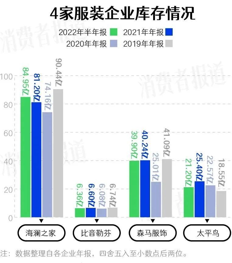 《消费者报道》对A股4家服装企业的库存数据进行了对比。截至2022年半年报,海澜之家的存货达到了84.95亿元,存货规模远超比音勒芬、森马服饰、太平鸟等同行。