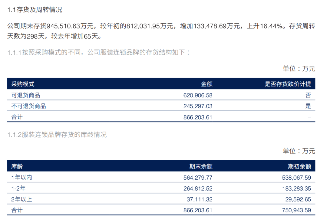财报显示,2022年,海澜之家的存货为94.55亿元,同比增长16.44%,占总营收的51%,其中不可退货商品库存为24亿元,两年以上库龄存货金额达3.71亿元,存货周转天数为298天,对比上年增加65天。