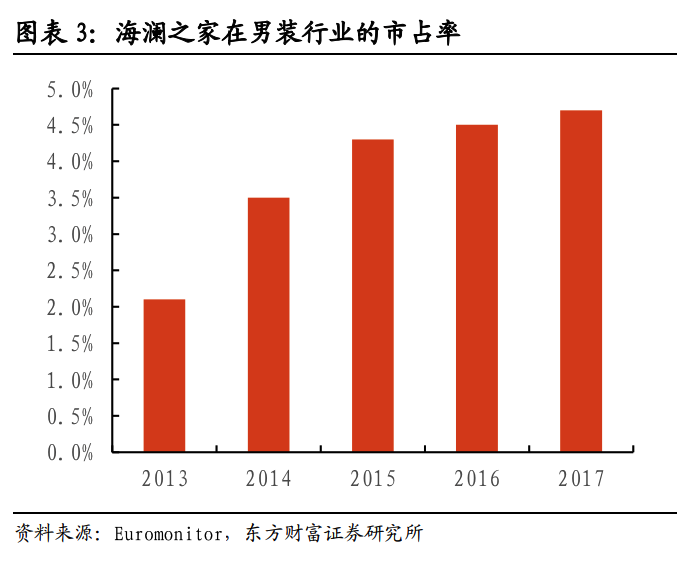 得益于明星效应,海澜之家的市场影响力显著提升。东方财富证券数据显示,2014年,海澜之家在中国男装市场拿到了3.5%的份额,位列中国第一大男装品牌。此后几年,海澜之家的市场份额节节攀升,2017年提高到了4.7%。