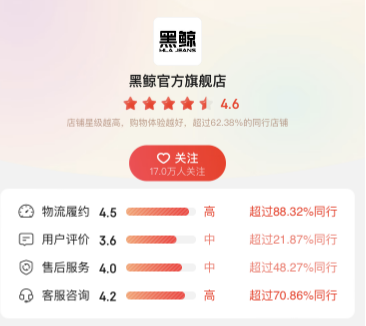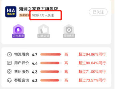 首先,体现在用户对海澜之家旗下子品牌的关注度上。以面向都市新青年的黑鲸(HLA JEANS)为例,在其京东旗舰店上,粉丝数为17万,对比来看,海澜之家在京东旗舰店上拥有着1639万的关注。