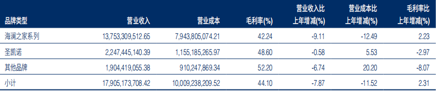 其次,则是其在营收中的存在感较弱。从2022年的年报来看,在全部营收中,海澜之家主品牌实现营收137.53 亿元,作为子品牌的圣凯诺取得了22.47亿元的营收,而包括黑鲸、OVV等子品牌在内的“其他品牌”一项,所带来的营收总和仅约为19亿元。