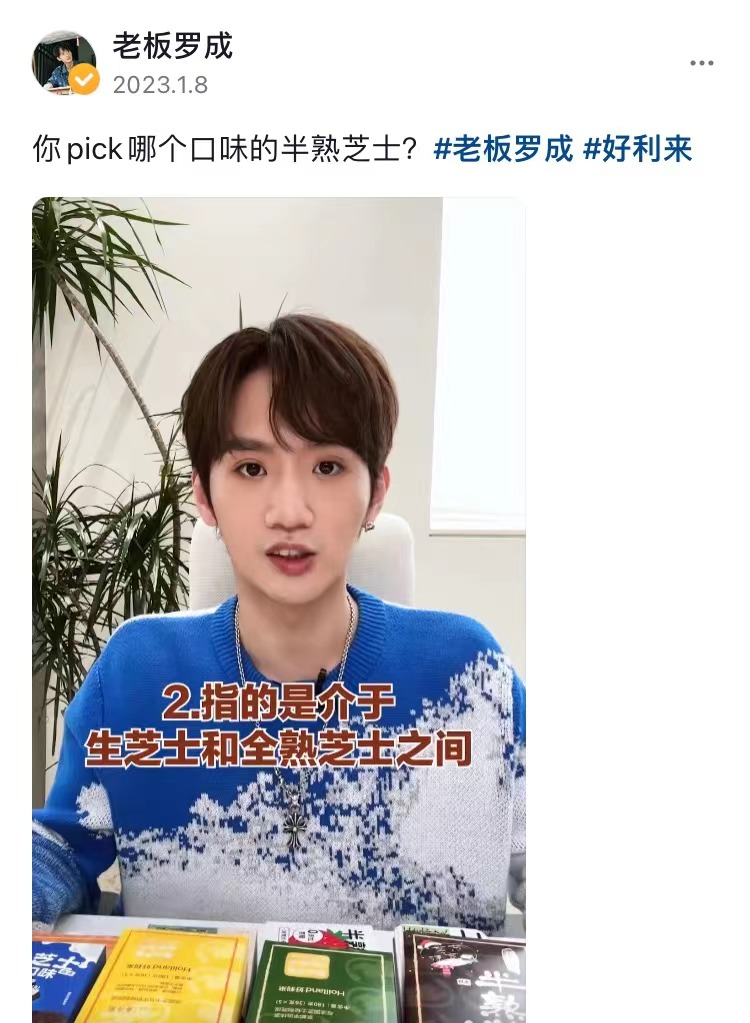 (在抖音上,罗成向粉丝介绍好利来半熟芝士等产品)