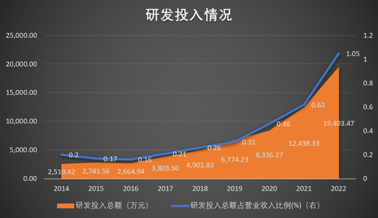 除此之外,海澜之家对研发的投入也在增加。2021和2022年,海澜之家研发投入分别同比增长49.4%和56.45%,远高于营业总收入的增速。2022年,海澜之家研发投入总额为1.94亿元,占营业收入的比例达到1.05%,上市以来首次突破1%。
