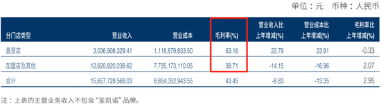 与此前的线上、线下渠道类似,海澜之家直营店的毛利率也在加盟店及其他之上(不含“圣凯诺”品牌),而且差距基本在20个百分点以上。以2022年年报为例,直营店毛利率为63.16%,加盟店及其他为38.71%,二者相差24.45个百分点。