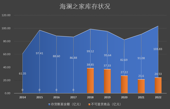 如图所示,2014年海澜之家存货账面余额仅为61.35亿元,到2015年猛增至97.41亿元。此后几年维持在80亿元-100亿元之间。最终在2022年突破100亿,为103.83亿元。