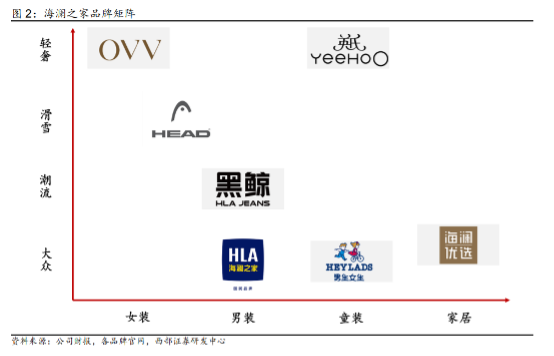 在国民品牌“海澜之家”的基础上,公司于2017年后相继推出潮流男装品牌黑鲸、女装品牌OVV、生活类家居品牌海澜优选,收购婴童装品牌男生女生、英氏YeeHoO,代理运动品牌HEAD(海德),覆盖了男装、女装、童装、职业装、家居服以及家居生活用品等六大细分领域,力图从“男人的衣柜”逐步转型为“全家人的衣柜”。