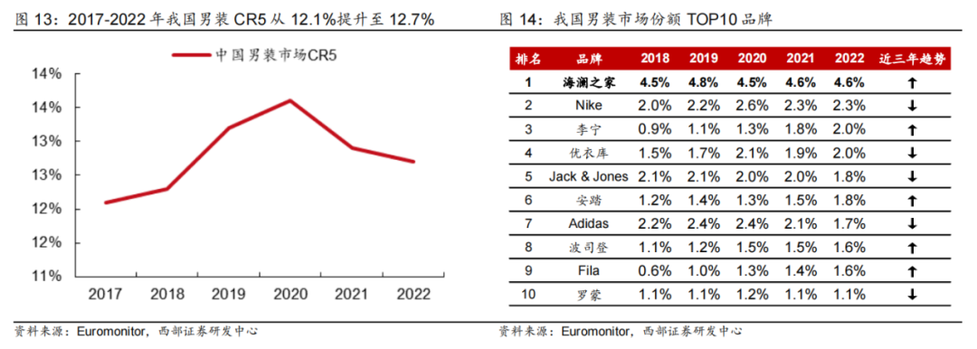 从2002年第一家门店开业以来,海澜之家品牌已成立21年,从西服自选店,到连续多年男装品牌,市场占有率第一的国民品牌,海澜之家发展的每一步都是品牌不断发展和成长的过程。根据 Euromonitor、西部证券研发中心数据显示,2022年海澜之家市占率为4.6%,遥遥领先第二名Nike的2.3%,且在疫情期间保持市占率提升趋势。今年,海澜之家又官宣张颂文成为品牌全新代言人,更好地触达消费者,为品牌带来更好的关注度与新鲜感。与张颂文的人生一样,海澜之家在产品和经营上二十年如一日,低头耕耘。海澜之家关注消费者在具体生活中的需求,并实现它。