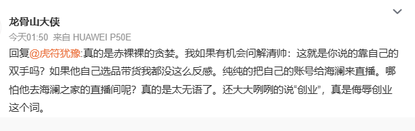 但对于解清帅而言,他口中的“靠自己电商创业”显然并不能成为说服大众接受他直播带货的体面理由。