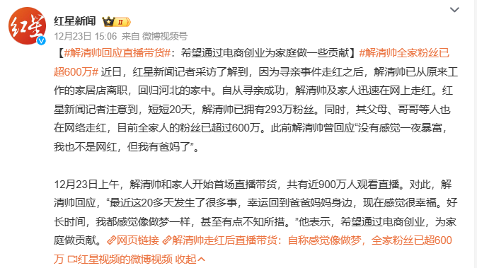 在回应直播带货时,解清帅说“现在我想尽我的绵薄之力,做一些有意义的事,希望更多的孩子回到父母身边。父母也很支持他直播带货,希望通过电商创业为家庭做一些贡献。”